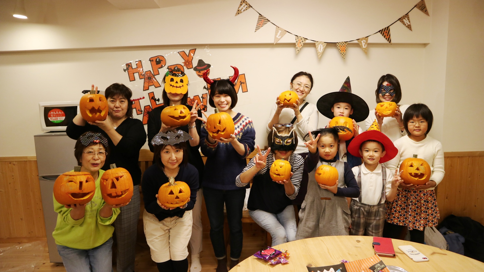 最後に完成したカボチャをみんなで写真に撮ったり、ひとつひとつ違う顔を比べて見たり